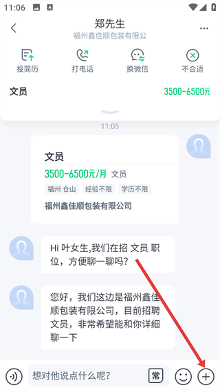 在职位详情页面,点击【聊一聊】按钮后,会进入和郑先生的聊天界面,你可以在这里开展求职相关的沟通交流。