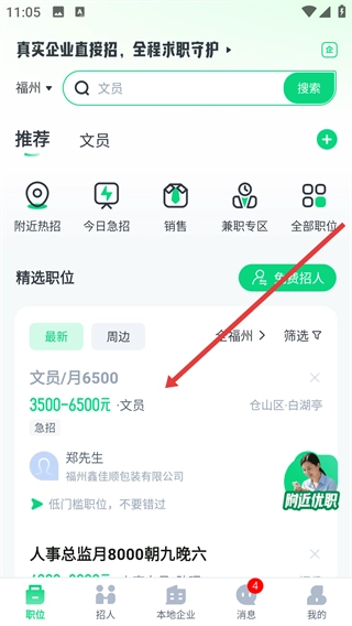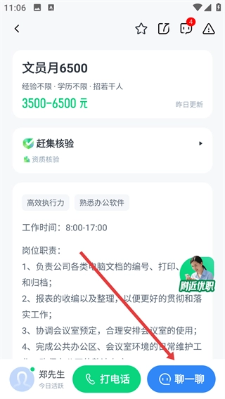 在职位页面,点击【文员/月6500-3500-6500元】这个职位,进入到该职位的详情页面后,就可以查看工作时间、岗位职责等相关信息了。