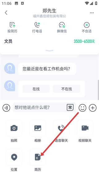 在功能栏里,点击【简历】这个选项,就能把个人简历发送给郑先生,从而推动求职的进展。