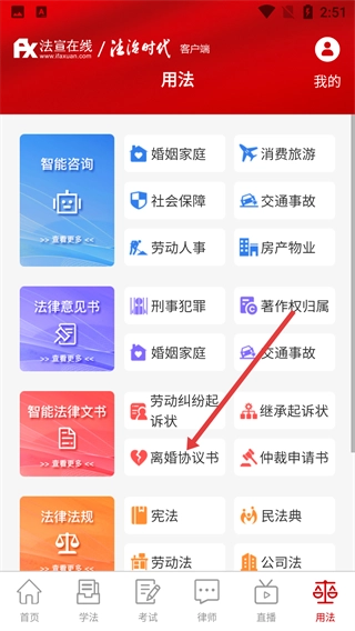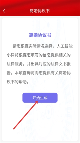 在用法页面,点击【离婚协议书】选项,即可进入离婚协议书生成页面。