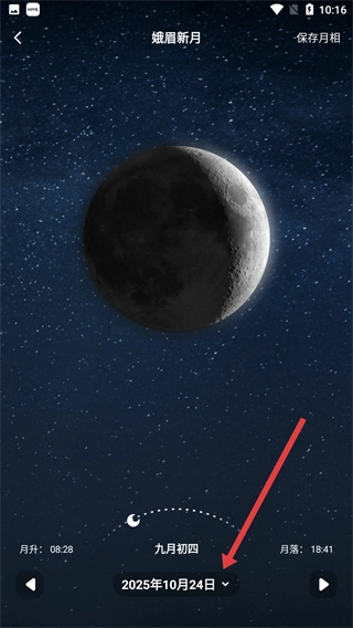 进入月相页面后,能查看【娥眉新月】的月升与月落时间,点击【2026年10月24日】可切换日期,以此查询不同时间的月相情况。