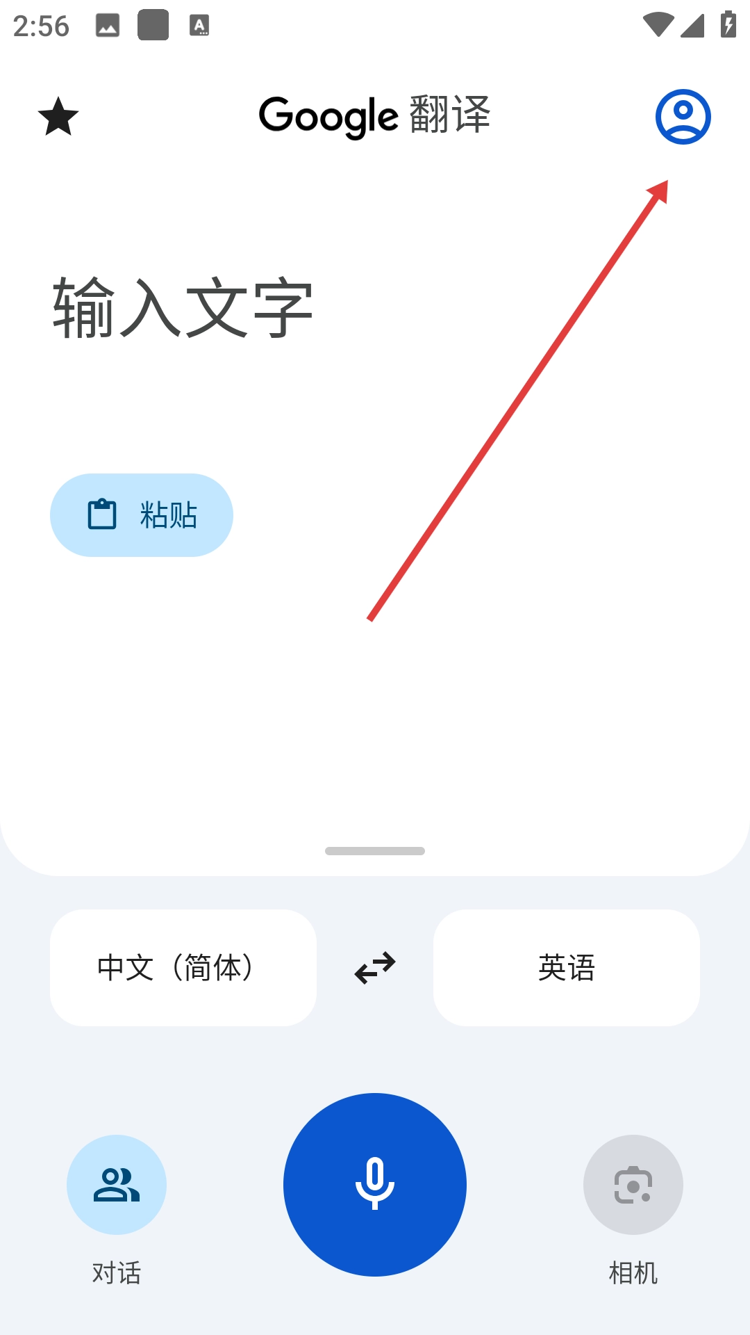 在Google翻译的主界面上,点击右上角的个人图标,就能展开功能菜单。