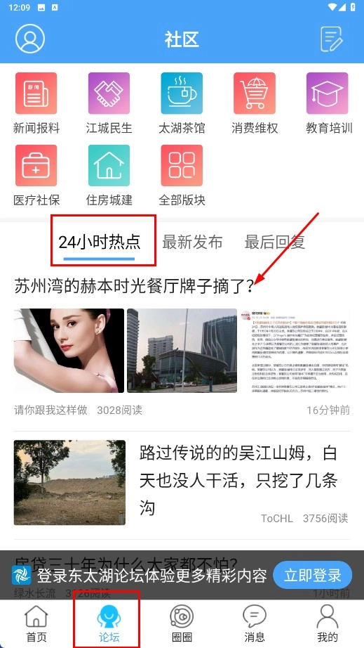 点击页面底部的【论坛】功能按钮,进入论坛页面后,选择【24小时热点】板块选项,即可查看相关的热点帖子。