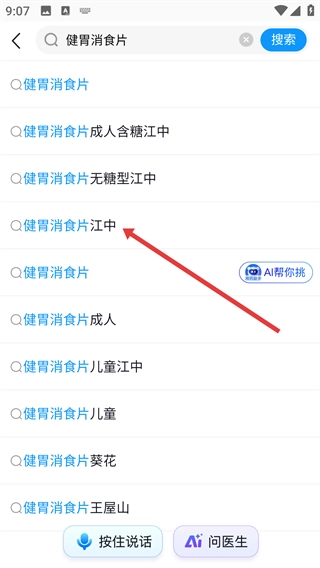 在搜索框中输入药品名称,比如【健胃消食片】,接着挑选精准的搜索建议,像【健胃消食片江中】,这样就能更迅速地找到对应的商品。