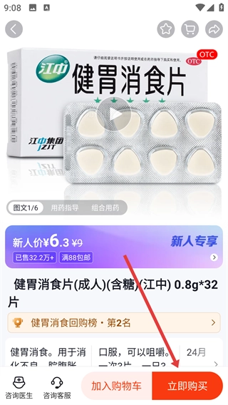 进入商品详情页面后,能查看【健胃消食片】的用药指导等相关信息,要是需要购买,点击【立即购买】按钮就能完成下单流程。