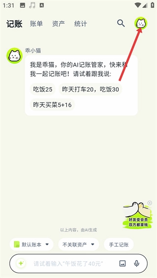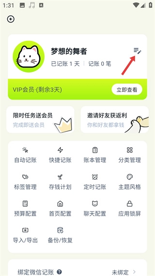 在记账首页点击右上角的【猫咪头像】图标,即可进入个人中心页面。