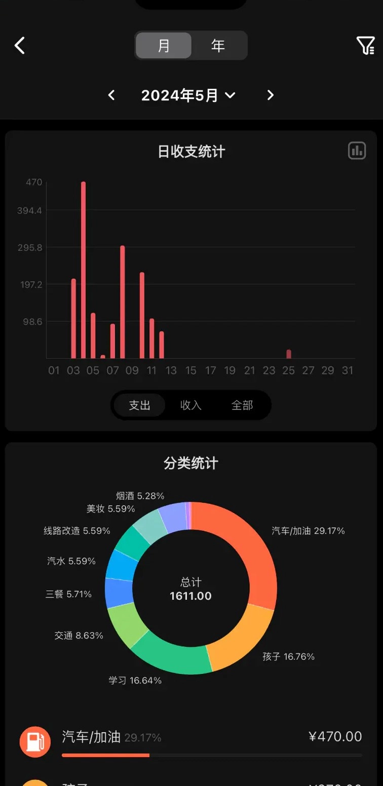【统计分析】:可按年、月或自定义时间进行统计,也能对单个分类展开详细分析;配备多种图表展示功能,助力从多维度精准定位消费问题。