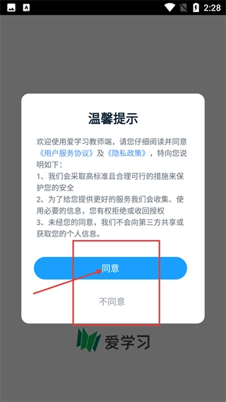 在使用【爱学习教师端】之前,我们仅收集必要的信息,并且不会擅自共享您的个人信息。点击【同意】按钮,您就能进入应用。