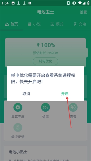 在耗电优化权限提示里点击【开启】按钮,就能进入权限设置页面。