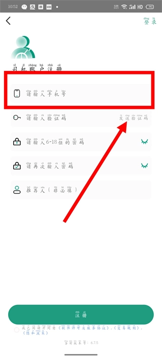 在注册页面,输入手机号后,点击发送验证码。