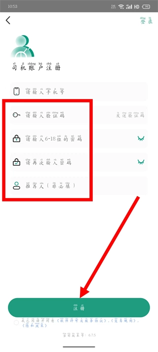 在我的页面,点击司机注册,进入注册页面。