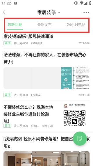 在【家居装修】页面,你可以通过【最新回复】【最新发布】【24小时热帖】这些选项来筛选内容。