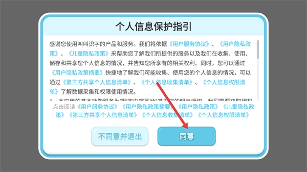 打开叫叫识字应用,当出现【个人信息保护指引】的弹窗时,点击其中的蓝色【同意】按钮,即可继续使用该软件的各项功能。