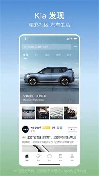 起亚是一个整合了看车、购车、用车、养车、社交及生活服务等全场景功能的综合出行服务平台,专注于满足用户从选车到用车的全周期需求。平台融合智能互联技术、专属权益体系、社群互动功能与实用服务内容,覆盖车型查询、金融支持、远程控车、专业养护、车主交流等多元场景,旨在解决传统用车过程中服务分散、体验割裂的痛点,让用户享受便捷、高效、贴心的全新用车体验。