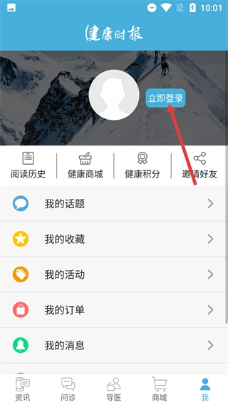 在【健康时报】的“我”页面,找到并点击【立即登录】按钮,即可进入登录界面。