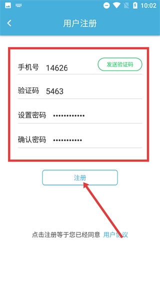 在用户注册页面,按顺序填写【手机号】与【验证码】,接着设置并确认密码,之后点击【注册】按钮,即可完成账号注册流程。