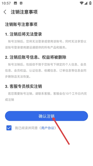 在注销注意事项页面,勾选同意《用户协议》后点击【确认注销】,即可完成账号注销操作。