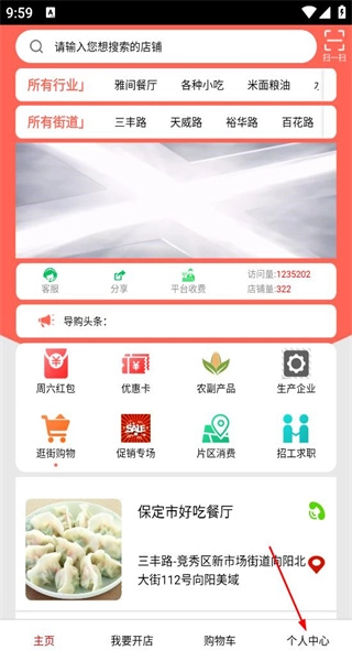 打开软件后,进入主页,能看到各类功能板块和店铺推荐,接着点击个人中心,就进入了个人信息页面。