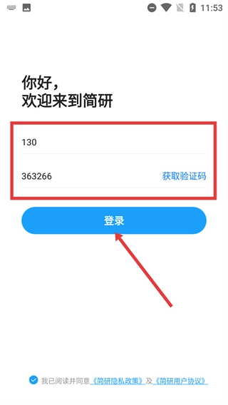 在简研的隐私政策或用户协议页面,点击【同意】按钮以接受相关协议条款,从而继续使用服务。