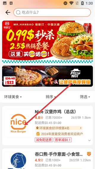 在环球美食的商家列表里,找到并点击【Nice汉堡炸鸡(总店)】,即可进入该商家的详情页面。