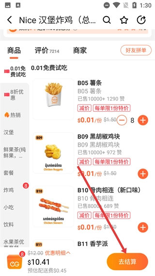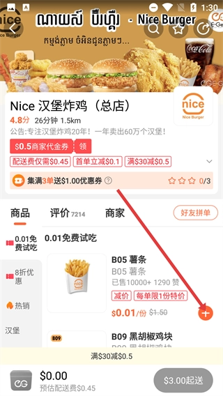 在商家详情页,点击商品旁边的加号,比如【B05薯条】对应的加号,就能把该商品添加到购物车。