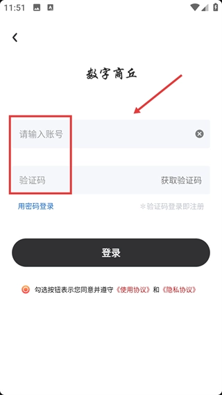 在账号登录页面,依次在账号输入框和验证码输入框中分别填写账号与验证码。