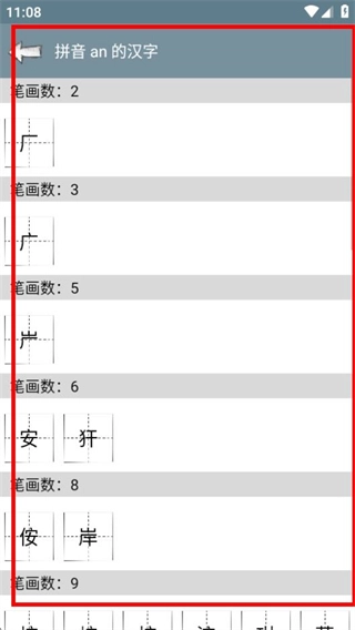 进入拼音为“an”的汉字页面后,就能查看对应笔画数的汉字内容了。