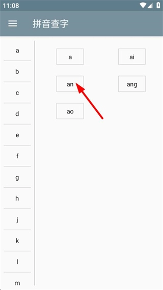 在拼音查字页面,点击“an”这一选项,就能看到所有拼音为“an”的汉字清单。