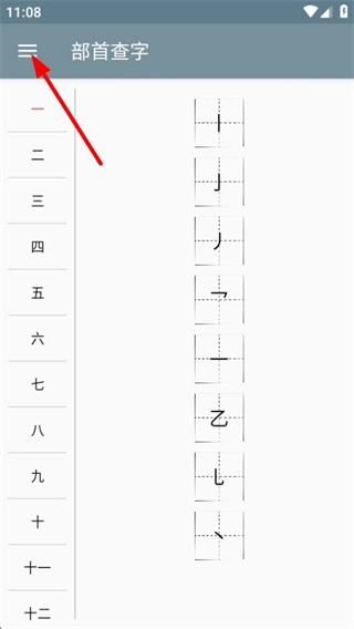 在快查字典的首页,点击左上角的菜单按钮,就能展开功能选项列表。