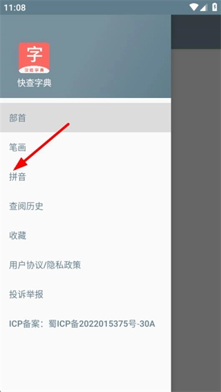 在功能选项列表里,点击拼音选项,就能切换到拼音查字页面。