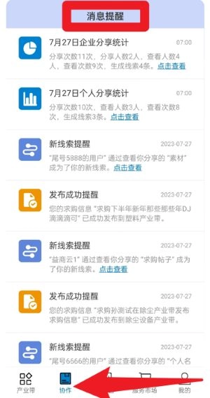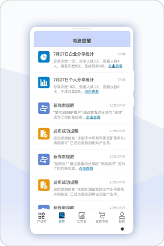 在协作页面的消息提醒区域,你可以查看系统推送的各类信息提醒,包括企业统计数据、新线索动态以及发布成功通知等,以便及时跟进相关业务。