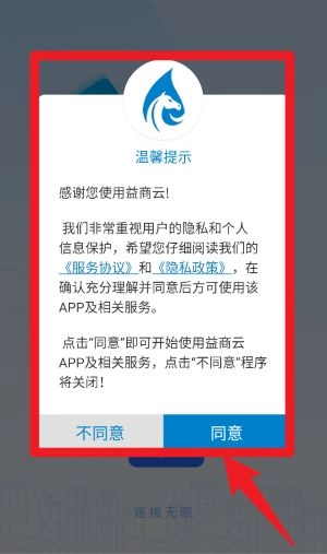首次打开应用时,请仔细阅读并确认《服务协议》,点击同意按钮后就能继续使用本应用及相关服务。