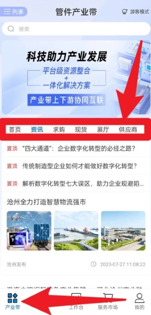 进入产业带页面后,你可以浏览首页、资讯、求购、现货、展厅以及供应商等各个板块的内容,从中获取行业相关信息和商业机会。