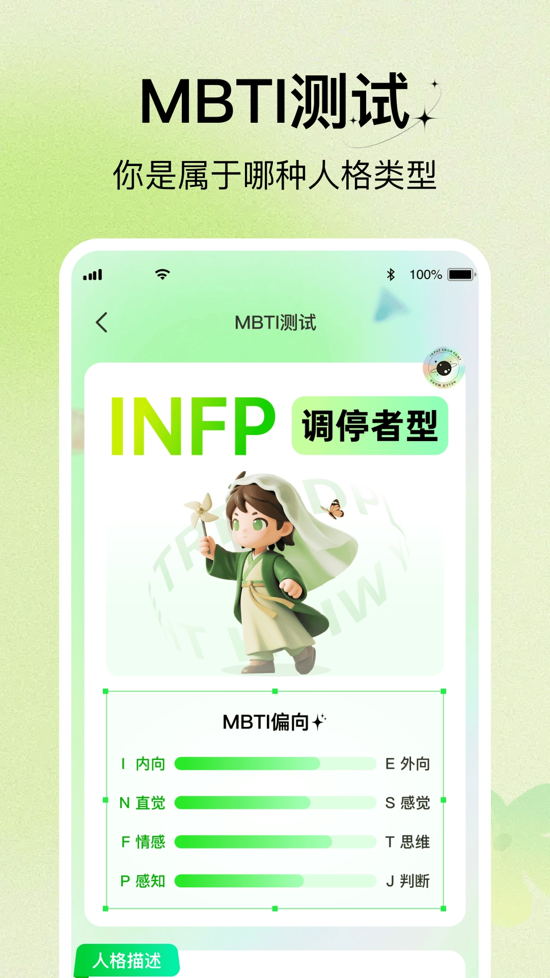 软件MBTI人格测试,可助力用户明确梳理自身人格特点,达成对自我的深度探寻。
