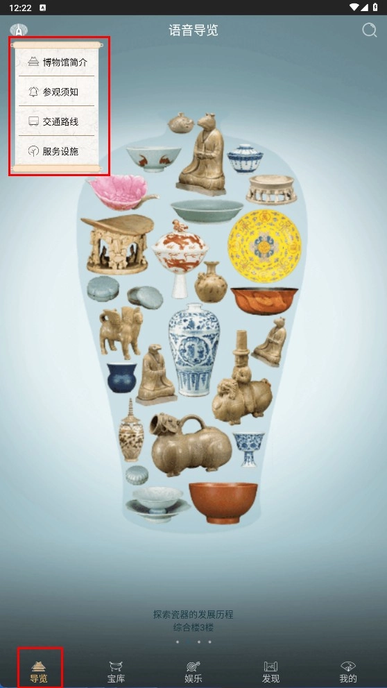 在“导览”板块,可查看博物馆简介、参观须知、交通路线、服务设施等信息,获取参观指引。