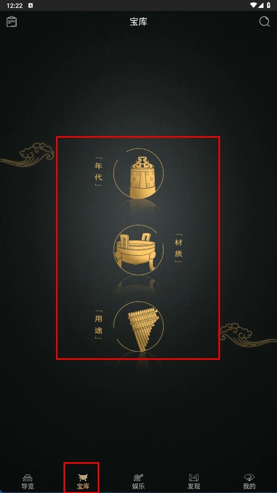 进入“宝库”板块,能够依据年代、材质、用途等类别来浏览文物,从而更深入地了解馆藏资源。