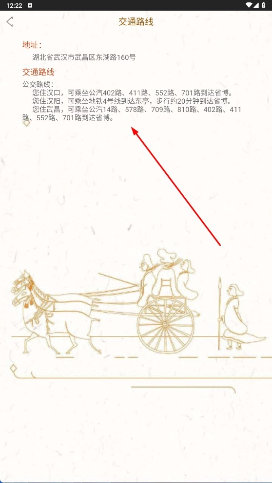 点击“交通路线”选项,就能查看博物馆的具体地址,以及公交、地铁等各类交通方式的详细路线信息,方便您规划出行方案。