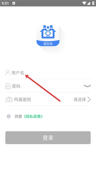 在医生端的登录界面,点击【用户名】对应的输入框,为输入账号信息做准备。