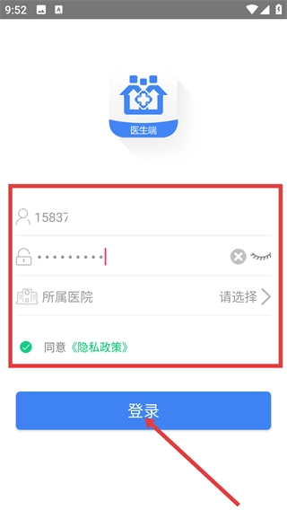 在登录页面,按顺序填写「用户名」「密码」,选定「所属医院」并勾选同意《隐私政策》,随后点击「登录」按钮即可完成登录流程。