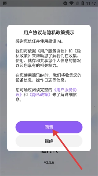 在简讯IM的用户协议与隐私政策提示界面,点击【同意】按钮以确认接受相关协议条款,从而继续使用服务。