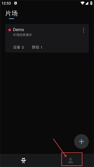在【片场】页面里,此界面会展示【Demo-片场仅供演示】的提示,同时包含【设备-3】与【群组-1】的相关信息,点击页面底部的人形图标,就能进入到个人相关的界面。