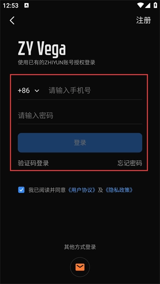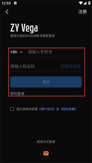 在【ZY-Vega】的登录界面,若选择验证码登录这一方式,需要先填写【请输入手机号】这一栏,接着点击【获取验证码】按钮,之后把收到的验证码填入【请输入验证码】对应的输入框,就能完成登录操作。
