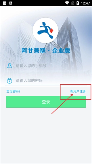 在【阿甘兼职·企业版】的登录界面,要是您是第一次使用,能够点击页面上的【新用户注册】按钮,从而开启账号注册的步骤。