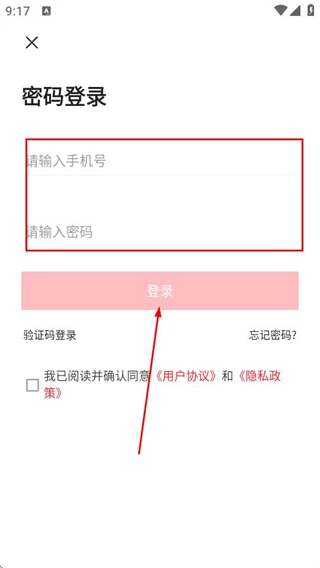 在密码登录界面输入手机号与密码,勾选相关协议后,点击登录按钮即可完成账号登录流程。