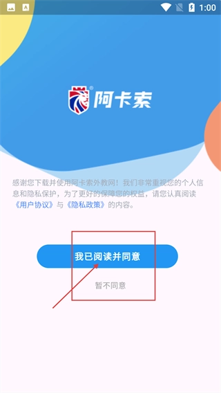 进入【阿卡索】的初始页面后,点击【我已阅读并同意】按钮,就能进入后续的登录流程了。