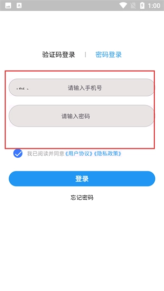 切换到【密码登录】界面,需要填写【请输入手机号】和【请输入密码】这两个字段,接着点击【登录】按钮;若忘记密码,也能通过【忘记密码】功能找回账号。