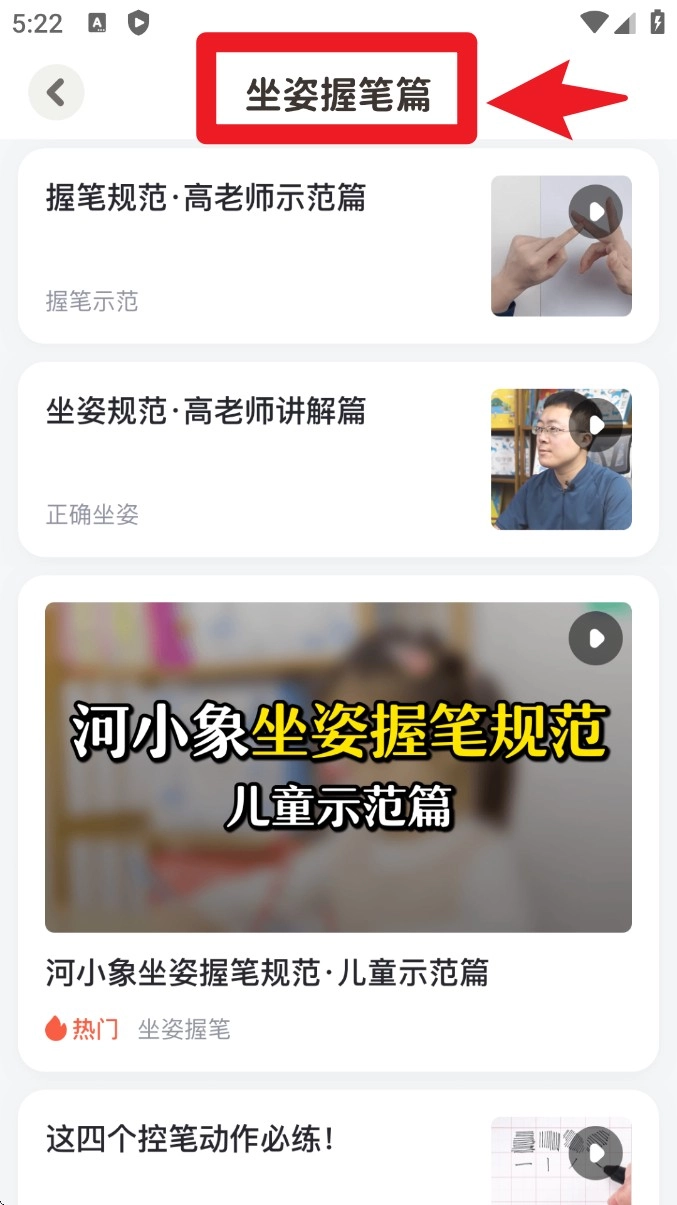 进入坐姿握笔相关内容的学习后,可以观看握笔规范、坐姿讲解、儿童演示等不同类型的示范视频,以此来帮助学习者掌握正确的书写姿势。