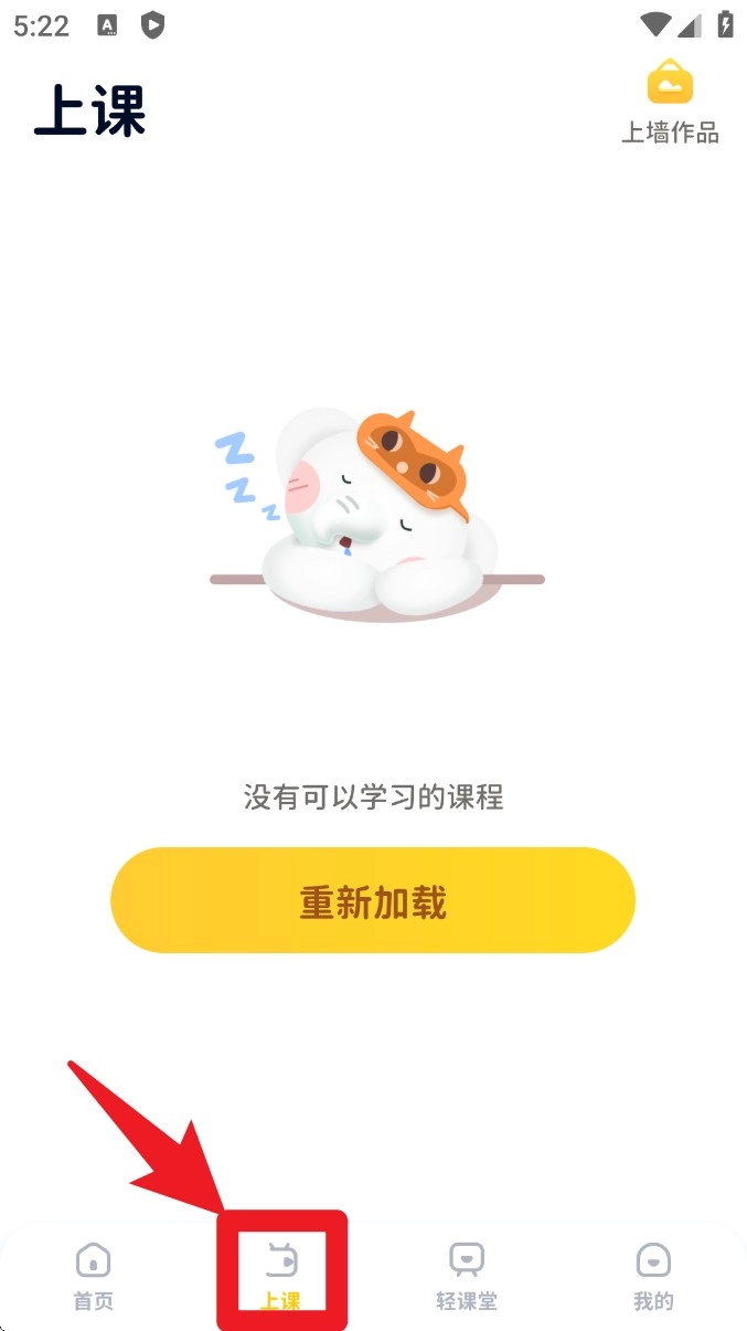 点击底部导航栏的“上课”选项,即可进入课程学习页面;若当前没有可学习的课程,可点击页面下方的按钮重新加载课程内容。