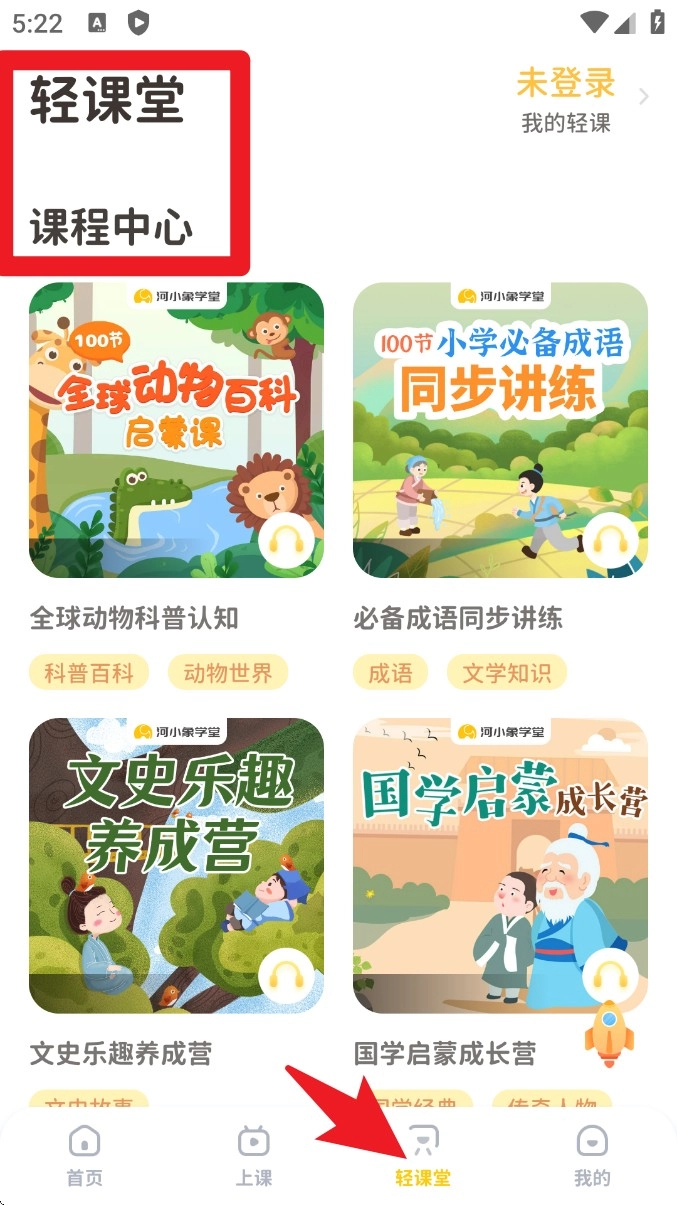 切换到轻课堂,即可浏览海量启蒙课程,涵盖动物百科、成语讲练、文史兴趣营等内容,有助于拓展课外知识。