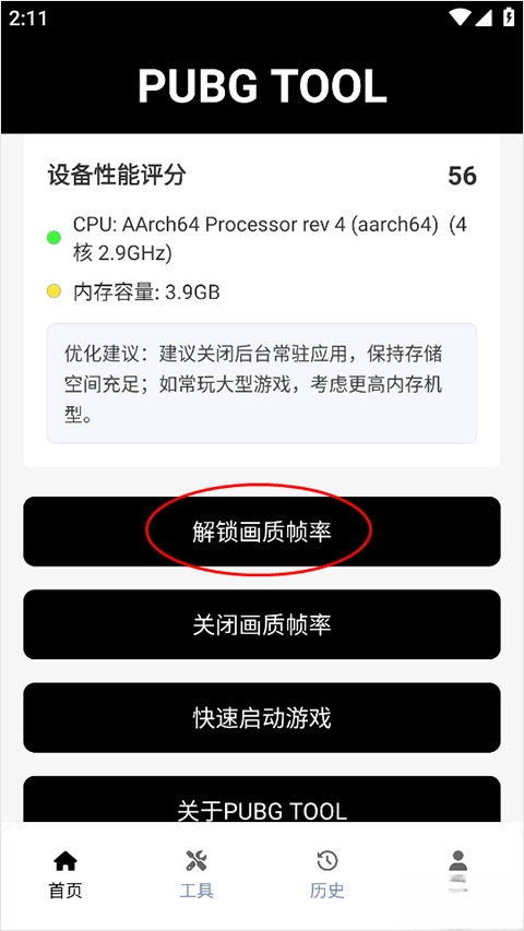 提前在手机上安装好和平精英游戏,接着打开NSS画质助手,在其首页找到并点击解锁画质帧率的选项。